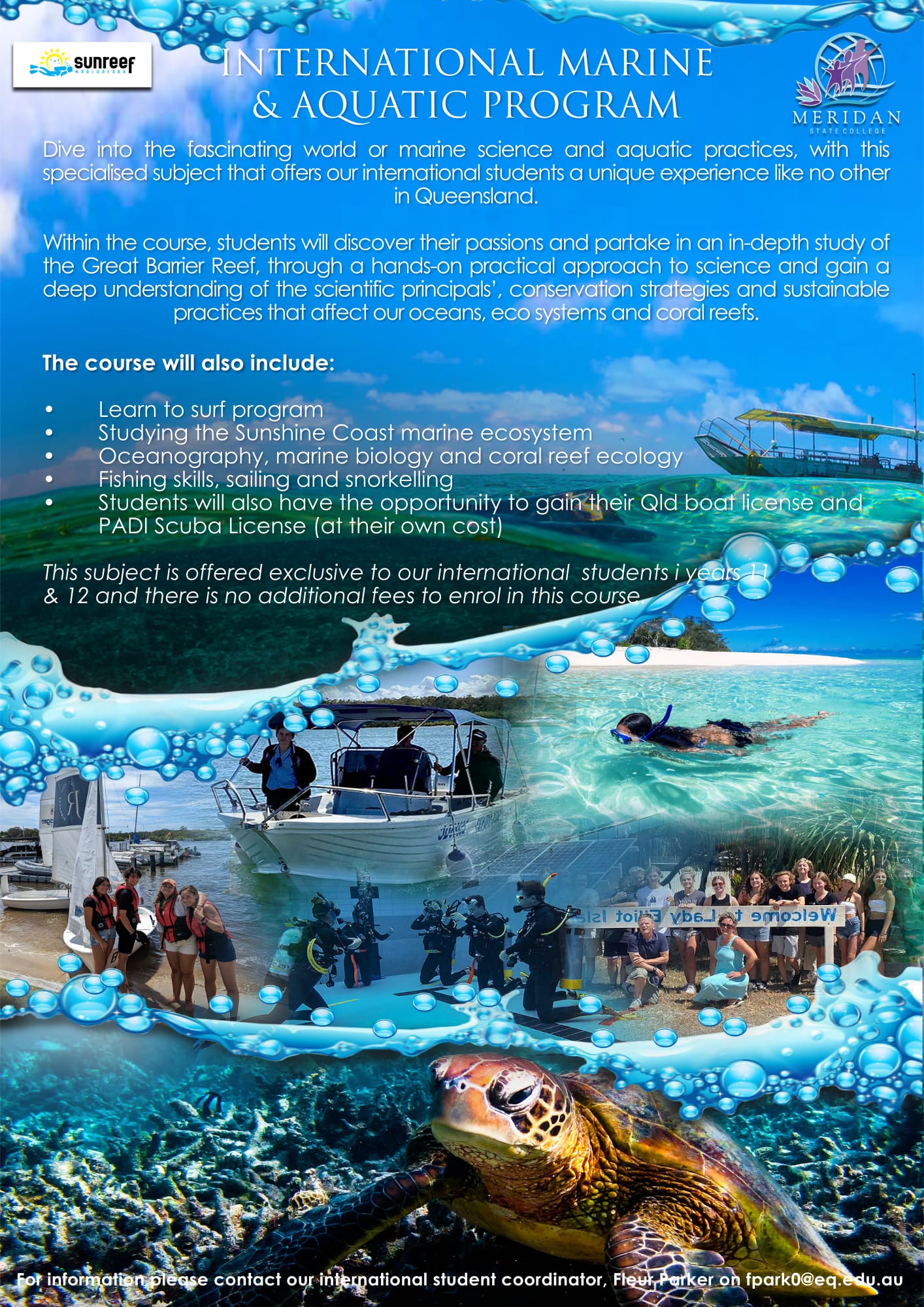 Zum anderen gibt es das International Marine & Aquatic Program mit einer Kombination aus den theoretischen Kursen der Oberstufe mit praktischen Laborerfahrungen und Feldarbeitstechniken. Die Schüler lernen alle marinen Ökosysteme kennen, die Queensland zu einem so einzigartigen Ort machen: von den Felsenküsten bis hin zu Mangroven, Seegras und natürlich Korallenriffen. Die Klasse 11 macht ein Praktikum in Meereskunde in der Moreton Bay Research Station auf North Stradbroke Island. Die Feldarbeit der Klasse 12 findet an den Korallenriffen von Lady Elliot Island statt.
